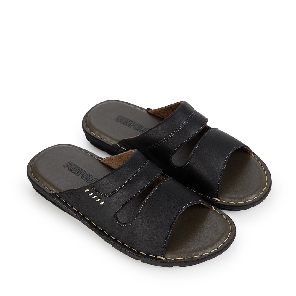 Dép Nam Quai Ngang Da Bò SUNPOLO AQN027 - Đen được làm từ chất liệu da bò cao cấp 100% dày dặn, mềm mại tạo cảm giác thoáng mát và dễ chịu, giúp quý ông tự tin trên từng chuyển động. Kiểu dáng dép nam tính, trẻ trung cùng với đường may tỉ mỉ và sắc xảo vô cùng chắc chắn, bền bỉ. Đế đúc cao su tự nhiên được thiết kế xẻ rãnh chống trơn trượt, tăng cường độ bám. Phần lót da thật tạo đệm êm chân khi di chuyển, mát mẻ không gây bí bách cho lòng bàn chân.