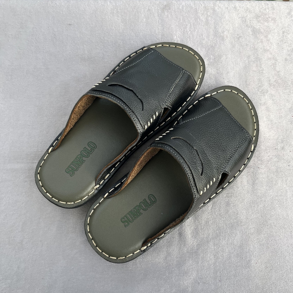 Dép Quai Ngang Nam AQN028 Da Bò SUNPOLO Đen